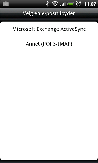 Trykk ‘E-post’ i applikasjonsmenyen. Dersom du ikke har satt opp en konto vil du bli forespurt om å gjøre dette nå, velg i så fall kontotype ‘Microsoft Exchange ActiveSync’. Dersom du alt har satt opp en konto velger du ‘Kontoliste’, ‘Ny konto’ og ‘Microsoft Exchange ActiveSync’.