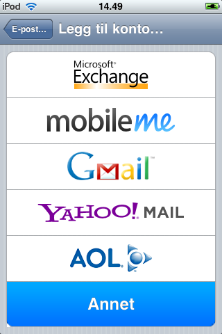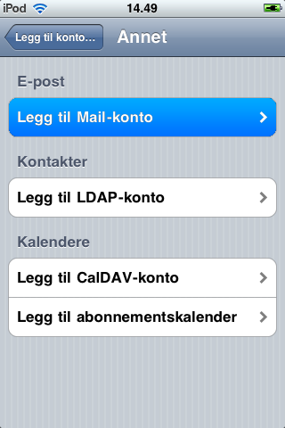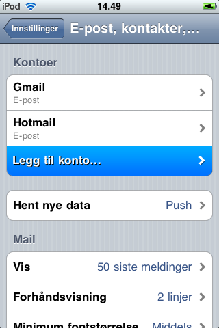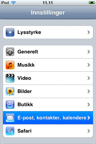 Velg ‘Innstillinger’ på din IPhone/IPod Touch, og bla deg ned til du finner feltet ‘E-post, kontakter, kalendere’.