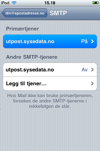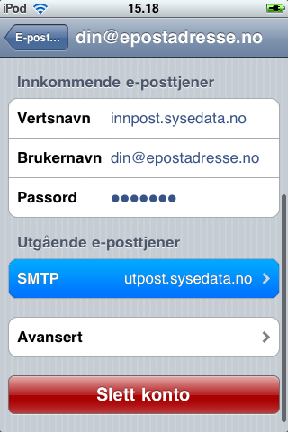 Når du er ferdig med å fylle ut all informasjon for epostkontoen vil skjermbildet gå tilbake til en oversikt over epostkontoer som er satt opp. Du må nå velge den epostkontoen som du har satt opp og bla deg ned til utgående e-posttjener og velge den.