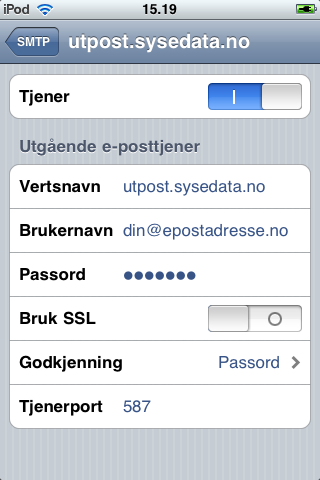 I skjermbildet foran deg nå dobbeltsjekker du at ‘Tjenerport’ er satt til ’587′, at ‘Bruk SSL’ er skrudd av, og at ‘Godkjenning’ er satt til ‘Passord’.
